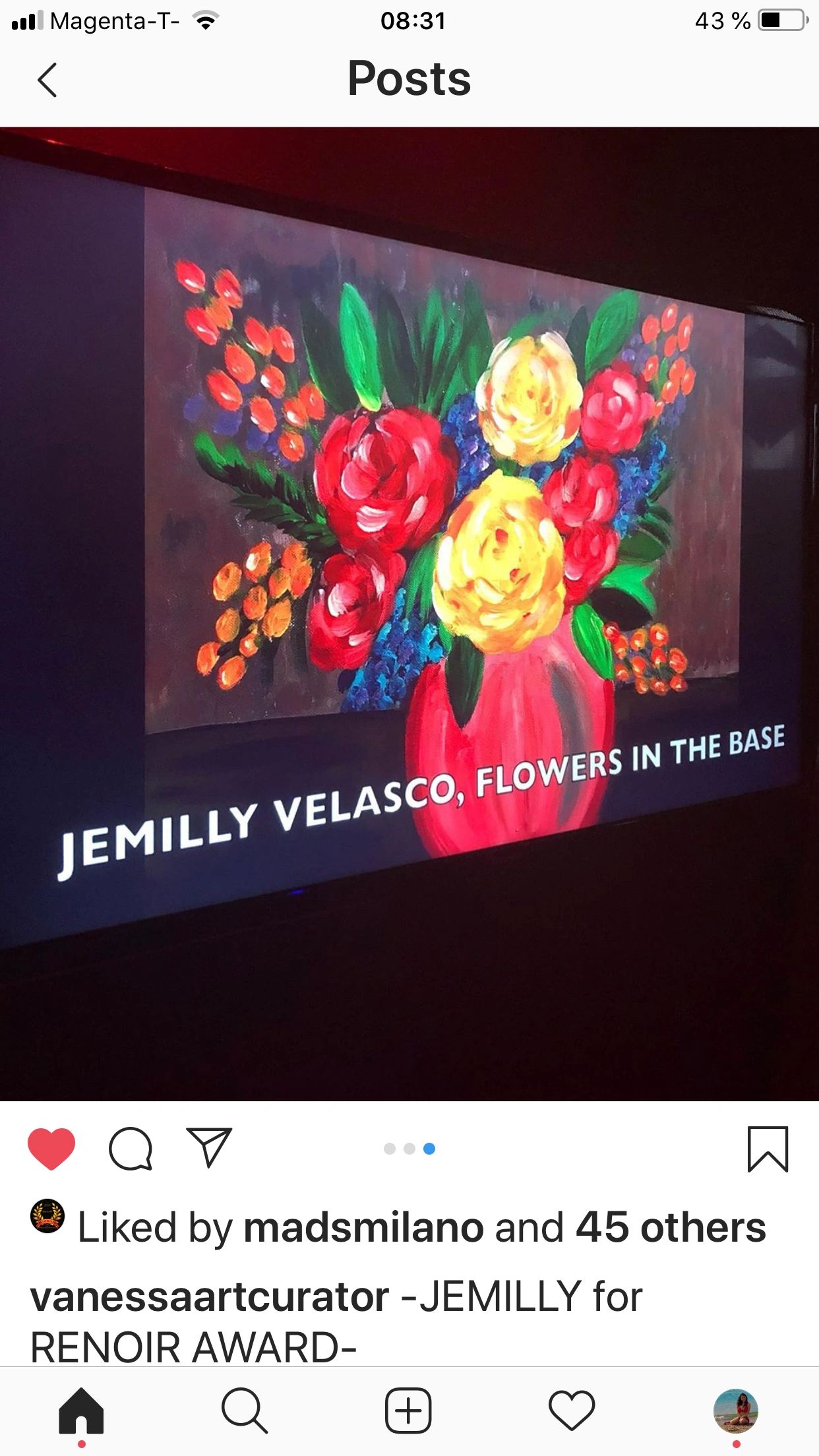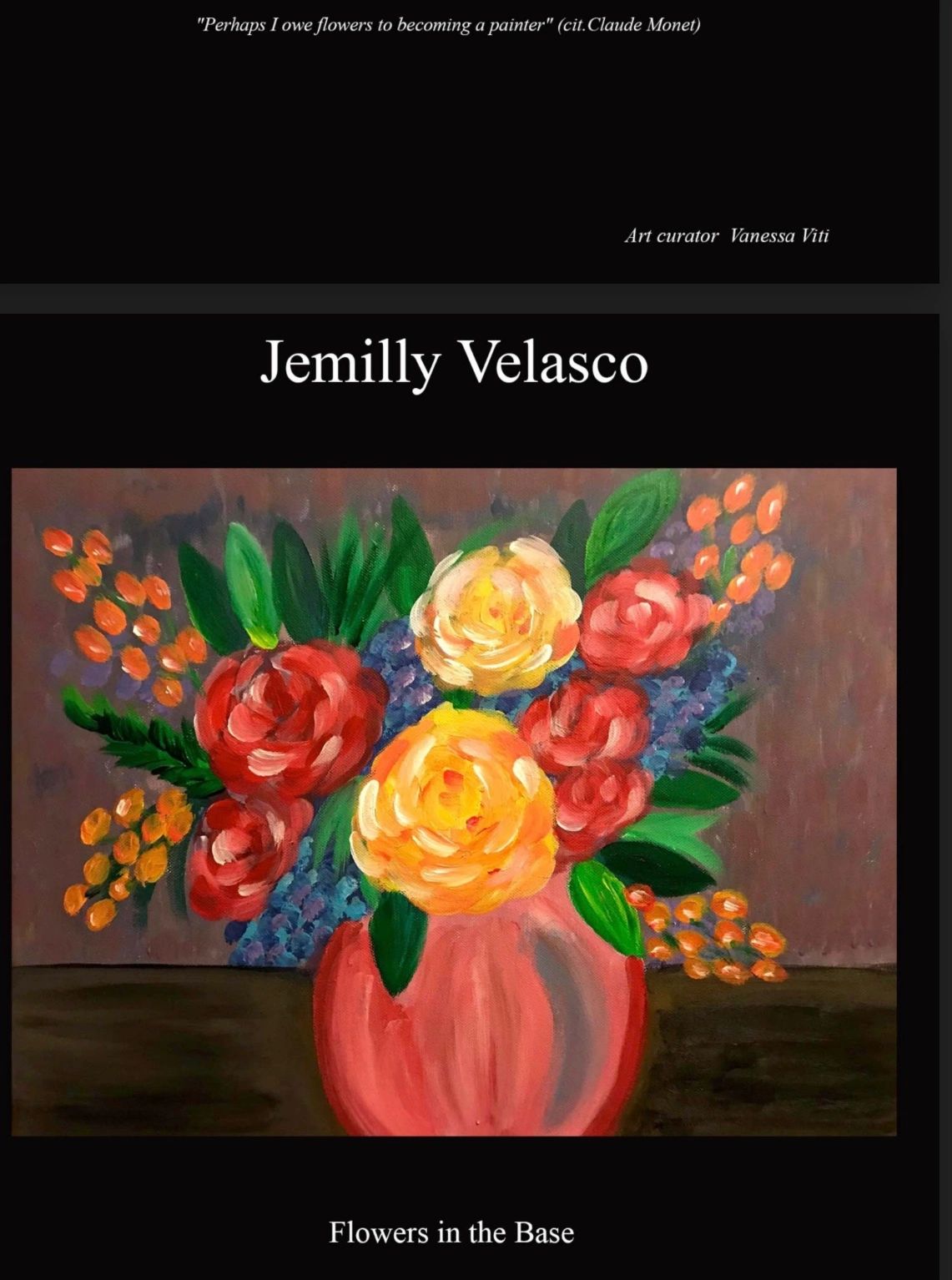 Jemilly Velasco is renowned primarily as a painter. The “Abundance” is the most famous of her works and her most circulated painting internationally. She has exhibited her “Abundance” painting on canvas in New York, Zurich, and Vienna.