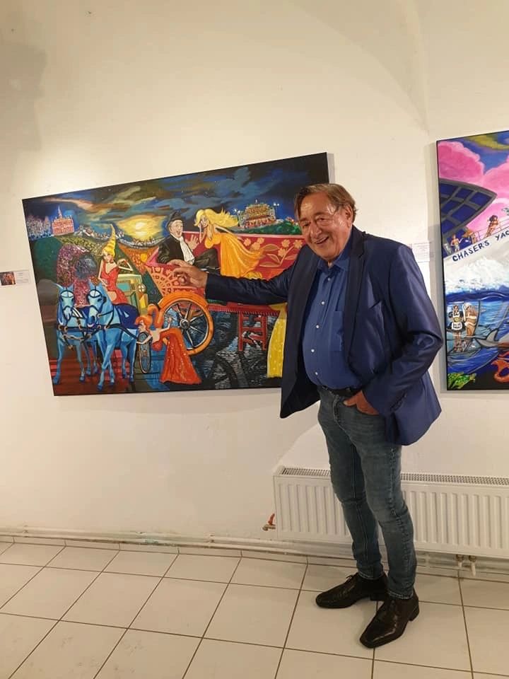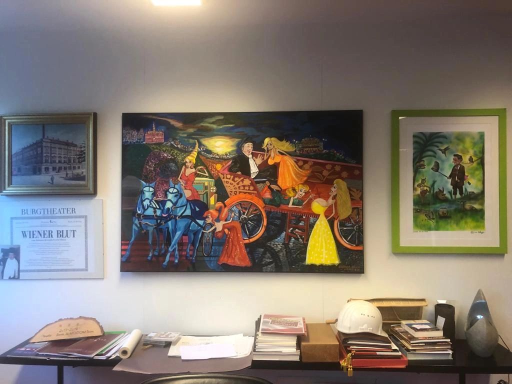 I was unaware of the fate of the “Biggest Ball” painting when Herr Richard Lugner was in the vicinity of the gallery to have lunch somewhere, and my beautiful blond art gallerist, Corinna Steiner, spotted him and invited him to come in the gallery to surprise him with something. Who could resist an invitation of a gallerist who looks like a living blonde Barbie doll, and so Herr Lugner accepted the invitation and was surprised to find himself immortalized in a canvas with his prominent Opera Ball guests. To make the story short, now the Biggest Ball is on display at the millionaire's office as he is now the new owner of it.