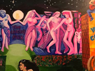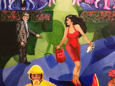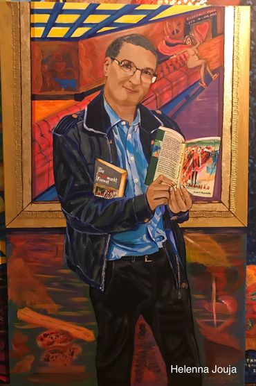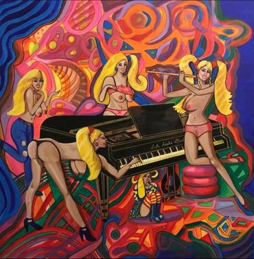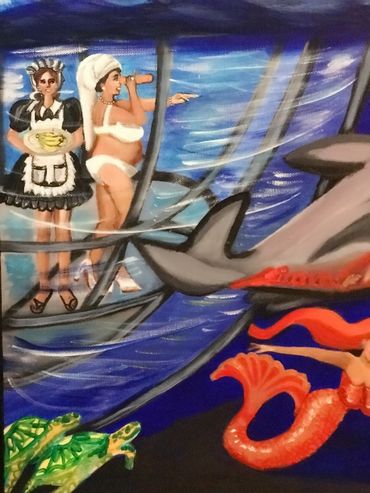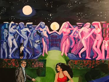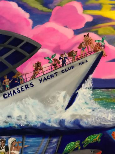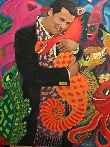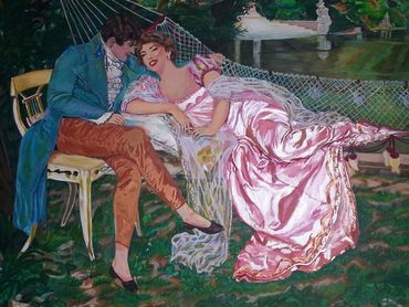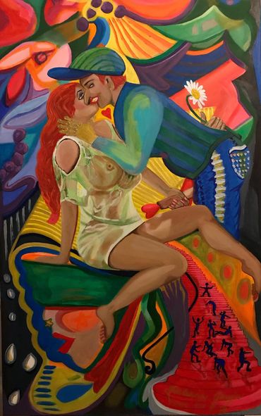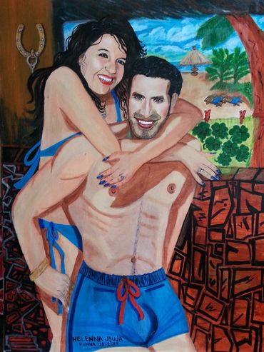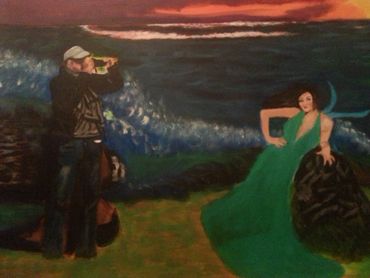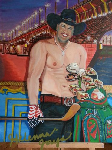 I originally entitled this painting the "Cowboy in the City" but he is actually just standing infront of a huge painting on the wall. I decided to just name it the "Golfer in Disguise" as he is wearing a cowboy outfit and holding an Iron 2 golf club which I painted extra long hoping that the ladies will have other idea what it is. I let you decide if he is a cowboy or a hockey player or something else in this painting. The diamond necklace the model is wearing is his daily necklace in real life, so I added it to his cowboy look.